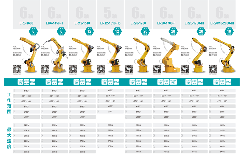 六軸工業機器人,有效臂長1450MM-3500MM;最大負載6KG-500KG.